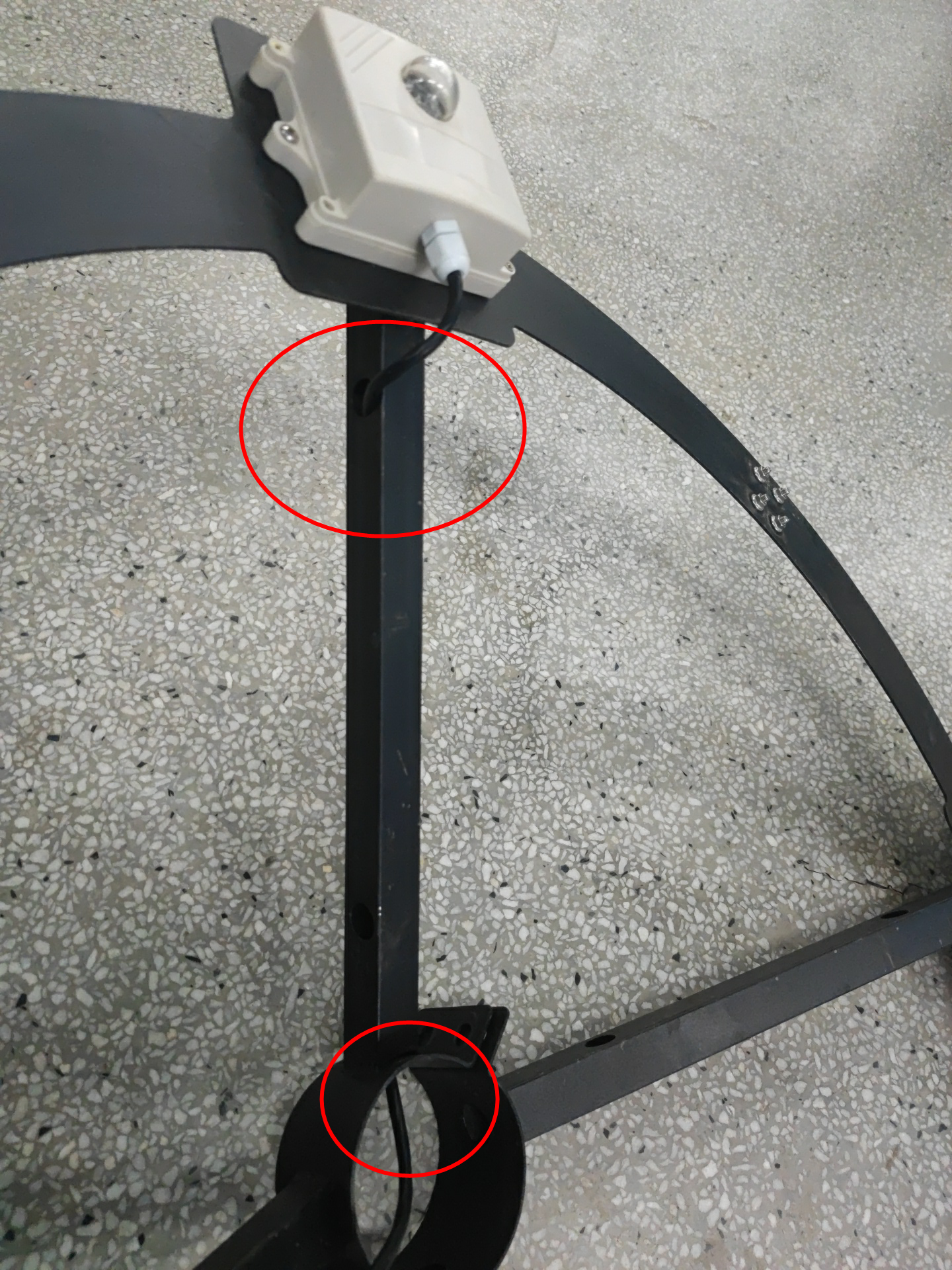 13、安裝固定圓盤支架并穿線,先將圓盤支架中間四個螺絲拆卸,然后將圓盤支架從燈桿上方套到燈桿上,光照傳感器朝向控制箱方向,將傳感器線從對應(yīng)的進線孔(距燈桿頂端1m)穿進燈桿,從控制箱的出線孔(離燈桿底座1.2m)穿出燈桿,最后將圓盤支架4個穿線孔與燈桿的4個進線孔對齊,固定4個螺絲并擰緊,注意不要壓到線