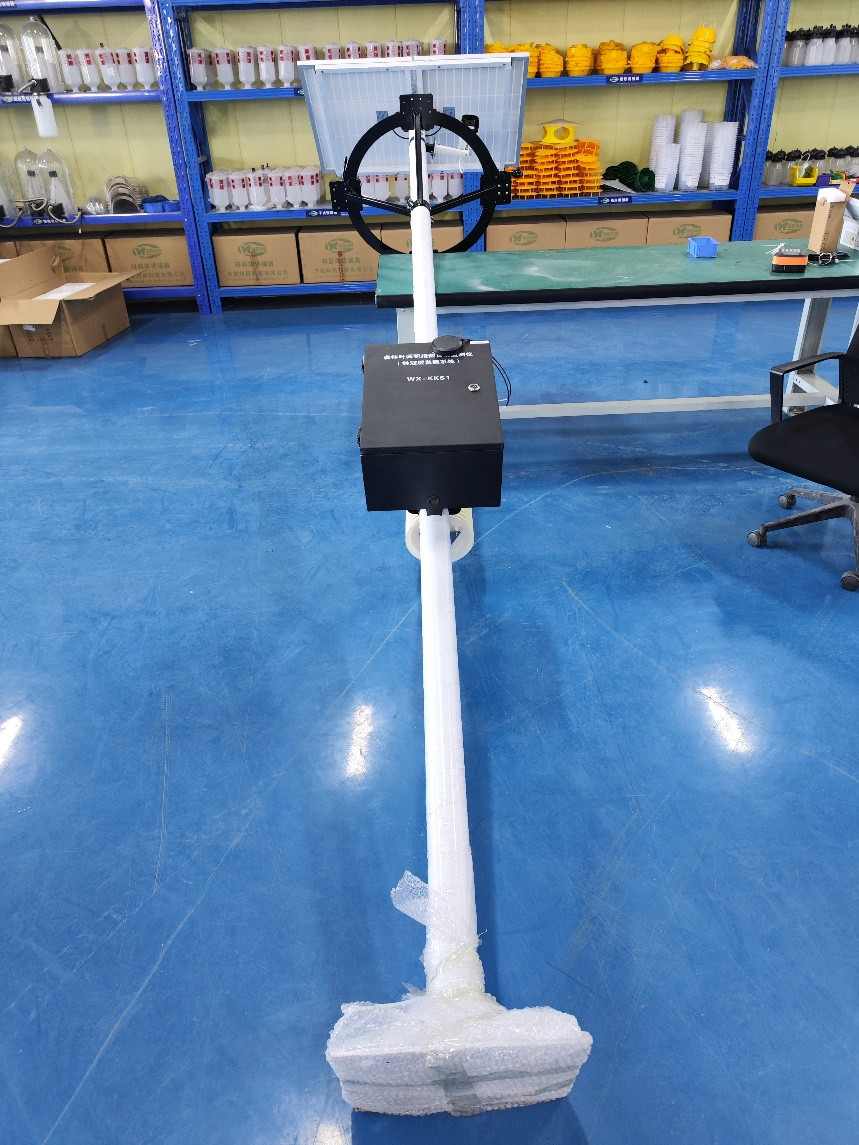 20、設(shè)備安裝完成(注:電池線從燈桿底部穿入控制箱;葉面溫濕度傳感器線從控制箱底部穿入控制箱,傳感器固定于樹枝枝干上)